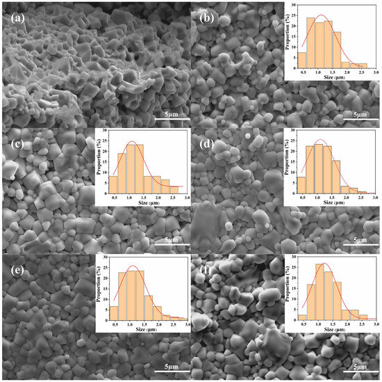 When the doping ratio of BaCo0.06Bi0.94O3 increases to 0.25 wt% and 0.75 wt%, the contact tightness between grains is significantly enhanced, the grain boundaries become clearer, and the number of pores is significantly reduced. At the same time, the morphology of the grains gradually tends to be regularized (Figure 4c,e) and the uniformity of the microstructure is improved, accompanied by an increase in the density of the sample. However, when the doping amount increases to 0.5 wt% and 1 wt%, abnormal grain growth and uneven pore distribution appear along the grain boundary region (Figure 4d,f), which may be the main reason for the sample density fluctuation. The increase of density may have an important influence on the improvement of magnetic properties.