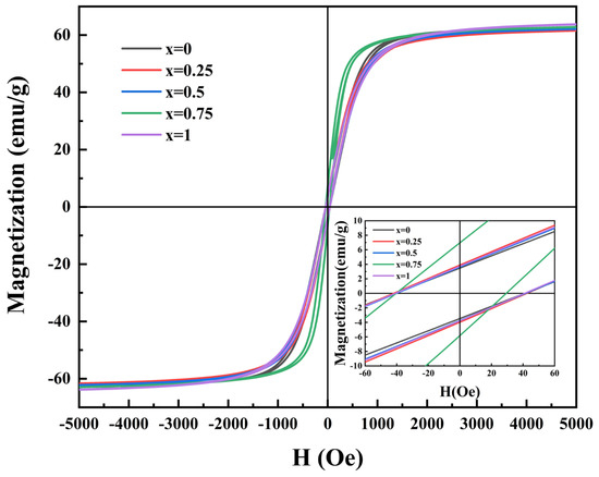 Figure 5 displays the magnetic hysteresis loops of Ni0.4Zn0.6Fe2O4/BaCo0.06Bi0.94O3 composite ceramics at room temperature. The data in Table 1 show that the saturation magnetization of the Ni0.4Zn0.6Fe2O4/BaCo0.06Bi0.94O3 composite ceramic sample decreases slightly and then continues to rise when the doping ratio is 0.25 wt% compared with the undoped sample. All the samples show a typical hysteresis under the applied magnetic field and have low coercivity (). When the BaCo0.06Bi0.94O3 doping concentration reached 0.75 wt%, the composite ceramic achieved magnetization saturation at a 600 Oe magnetic field while obtaining the minimum coercivity of 35.61 Oe. With the doping ratio increased to 1 wt%, the sample demonstrated the maximum saturation magnetization of 66.07 emu/g (Table 1). This enhancement of magnetization is essential to improve the signal-to-noise ratio of high-precision magnetic sensors because it is directly related to the detection sensitivity to magnetic flux. This enhancement in magnetization originated from the optimal addition of BaCo0.06Bi0.94O3, which improved grain size uniformity and increased sample density through reduced sintering temperature, thereby facilitating magnetization improvement. The improvement in saturation magnetization is due to the addition of BaCo0.06Bi0.94O3, which not only reduces the sintering temperature of Ni0.4Zn0.6Fe2O4 ferrite but also improves the uniformity of grain size and increases the density of the sample, thus promoting the increase in saturation magnetization. The scanning electron microscopy (SEM) microstructural analysis presented in Figure 4 further corroborated this mechanism.