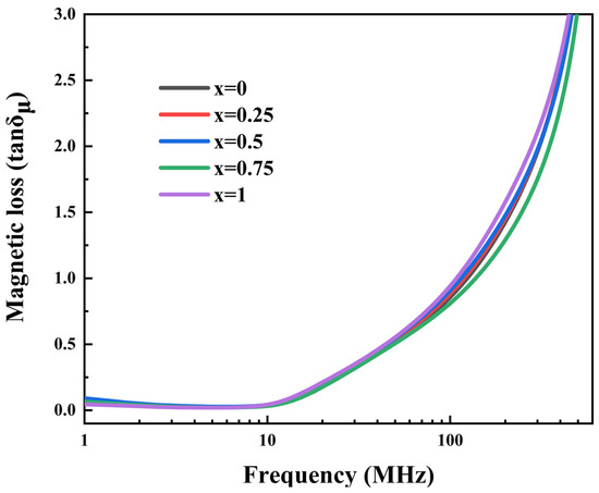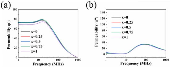Figure 6 demonstrates the frequency response characteristics of Ni0.4Zn0.6Fe2O4/BaCo0.06Bi0.94O3 composite ceramics after sintering at 900 °C for 1 h. Within the 1–1000 MHz frequency range, the real part of permeability (μ′) for all samples exhibited three-stage evolution characteristics: maintaining stable values in the low-frequency region (<10 MHz), showing a gradual increase in the mid-frequency region, and demonstrating a sharp decline in the high-frequency region. As seen in Figure 6a, a significant increase in the initial permeability and a decrease in the cut-off frequency are observed, which is consistent with Snoek’s law [31]. The results show that the appropriate amount of BaCo0.06Bi0.94O3 can significantly improve the permeability of the sample. When the doping amount is 0.75 wt%, the maximum initial permeability is about 73.74 (at a frequency of 1 MHz).