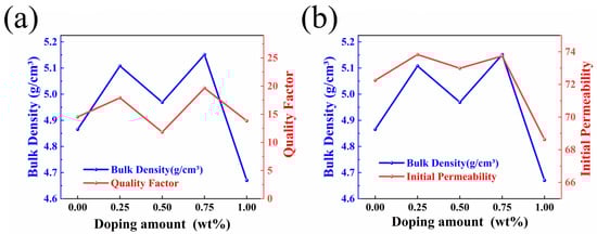 The quality factor is an important parameter to measure the loss characteristics of ferrite materials under an AC magnetic field, which is usually used to evaluate the energy loss and performance of materials. Figure 7a shows the fluctuation curves of the quality factor and density of the samples with the doping ratio of the additives. For ferrites, especially soft magnetic ferrites for high frequency applications, the quality factor is usually calculated by the following formula: