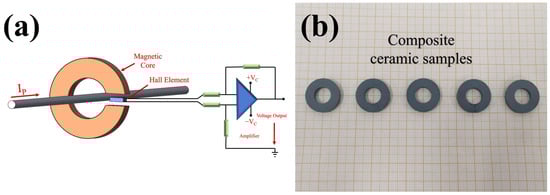 (a) Application of the magnetic core in the Hall sensor and (b) composite ceramic samples.