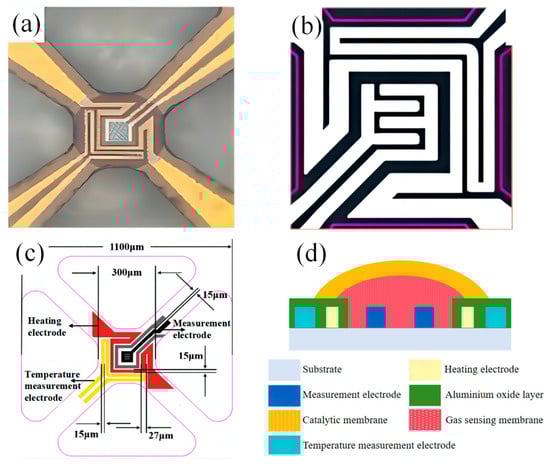 Figure 1a–c shows the arrayed MOS sensor chip developed and designed by our team, where Figure 1a shows the physical diagram of the chip and Figure 1b shows the electrode design of the chip. The electrodes are specifically divided into heating electrodes, temperature measurement electrodes and measurement electrodes, whose distribution positions and size parameters are shown in Figure 1c. The substrate is zirconium oxide with good mechanical strength. Since the MOS material is affected by the working temperature, we have chosen Pt as the heating electrode with good thermal stability and good linearity between temperature and resistance. In order to obtain the resistance change of MOS material more quickly and accurately, we chose Au with lower resistivity as the measurement electrode.