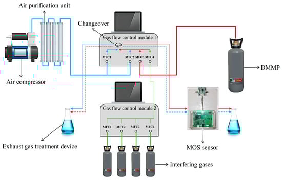 The test platform is shown in Figure 2. Air is supplied by an air compressor, and through the air purification device, the purified air is divided into two paths, MFC1 and MFC2 (referred to as 1-MFC1 and 1-MFC2), in the gas flow control module 1. DMMP is supplied by gas cylinders and enters MFC3 (referred to as 1-MFC3) in the gas flow control module 1. The interfering gases are supplied by gas cylinders, and the interfering gases enter MFC1, MFC2, MFC3, and MFC4 (referred to as 2-MFC1, 2-MFC2, 2-MFC3, and 2-MFC4) in the gas flow control module 2. Each of the above gases can be adjusted for flow size. The interfering gases are mixed after passing through 2-MFC1, 2-MFC2, 2-MFC3, and 2-MFC4, and the mixed interfering gases enter MFC4 (referred to as 1-MFC4) in the gas flow control module 1. After mixing, 1-MFC2+1-MFC3+1-MFC4 will be formed into the testing path, and 1-MFC1 will be the air path. Switching of the testing path and air path can be realized by controlling the changeover.