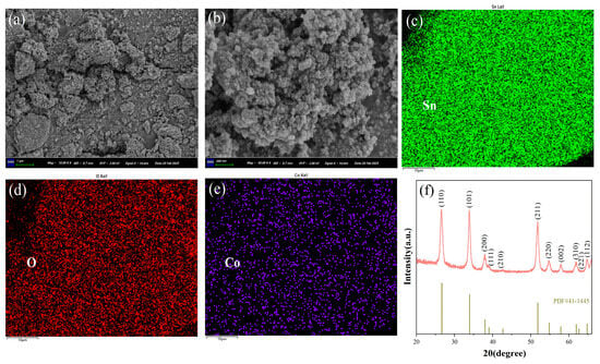 (a,b) SEM images, (c–e) EDS images and (f) XRD pattern of Co@SnO2 powder.