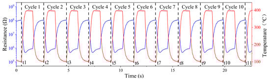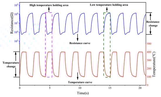 In this paper, we use a rectangular wave-based temperature dynamic modulation mode, which has been shown to help improve the sensor’s selectivity for the target gas [17], as shown in Figure 4. Compared to the temperature dynamic modulation mode of triangular and sinusoidal waves, this modulation mode has a high-temperature retention phase and low-temperature retention phase, where the MOS material can desorb the gases remaining on the surface of the material during the high-temperature retention phase and adsorb reactive oxygen species during the low-temperature retention phase thereby enhancing the response to the toxic agent. Such a heating mode is suitable for the detection of chemical warfare agents.