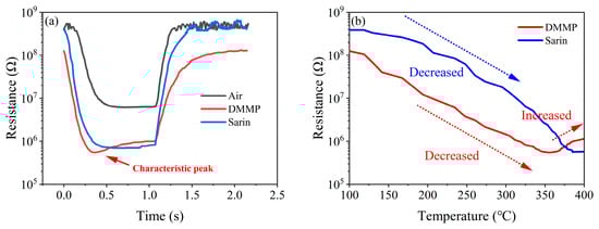 Figure 5b demonstrates the function of temperature and resistance, where the resistance response of DMMP showed a decreasing trend at 100–350 °C and an increasing trend at 350–400 °C, leading to the characteristic peak. Sarin’s resistance response consistently showed a decreasing trend in the heating area.