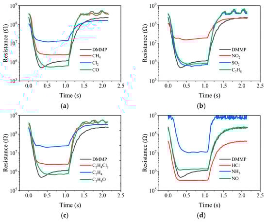 We took the 12 interfering gases as the control and performed the same test under the above-mentioned operating conditions. The results are shown in Figure 6. From Figure 6a–d, it can be seen that the sensor only produced a characteristic peak in the resistance response curve to DMMP, indicating that it had good selectivity to DMMP.