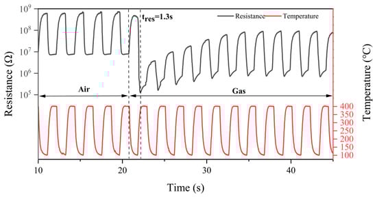 Response time is one of the properties to be focused on for chemical warfare agent sensors. In the temperature dynamic modulation mode described above, we first placed the sensor in the air, waited until the resistance stabilized, and switched to 0.5 mg/m3 DMMP, as shown in Figure 7. From the figure, it can be found that the resistance of the sensor can respond quickly to the change in temperature, and the response time can be up to 1.3 s.