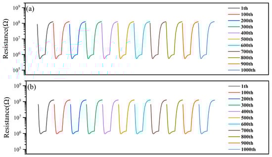 In order to test the stability of this sensor under the above temperature dynamic modulation, we continuously tested the sensor 1000 times to 0.5 mg/m3 DMMP and recorded the resistance response curves (1 pulse recorded every 100 times). The test results are shown in Figure 8a. It can be seen that the resistance curve of the 1000th time was not significantly different from that of the first time, and there was almost no change to the characteristic peak of DMMP. The same test was performed again after 130 days, and it can be seen that the characteristic peaks of the sensor for DMMP have slightly decreased, but still, a clear characteristic peak can be observed, as shown in Figure 8b, which indicated that the sensor was of good stability.