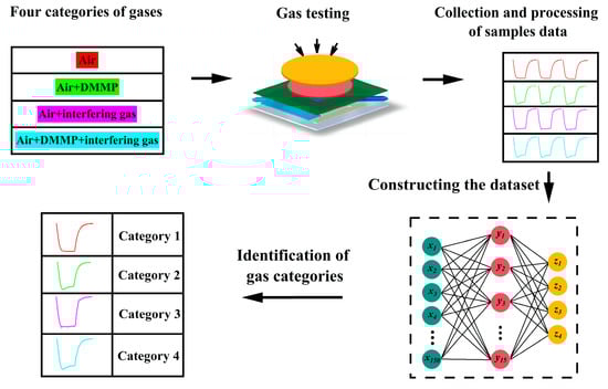 The samples detected by the sensor were categorized into a total of four categories, namely air, air+DMMP, air+interfering gas, and air+DMMP, interfering gas, which were numbered 1, 2, 3, and 4, respectively. The concentration of DMMP and 12 interfering gases are all 0.5 mg/m3. A total 200 samples were collected for each category of gas, forming a dataset (800 × 150), as shown in Table 1. Based on pattern recognition, different gas categories will be identified. Such a gas categorization allows for simultaneous verification of the scheme’s ability to identify DMMP and anti-interference [23].