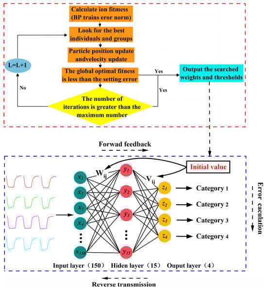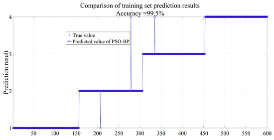 Figure 13 shows the result of the trained PSO-BPNN. It can be seen that the identification accuracy of the PSO-BPNN on the training set samples reached 99.5%, indicating that the model possessed a high degree of fit to the training data, but its generalization ability still needs to be verified in the identification of the test set.