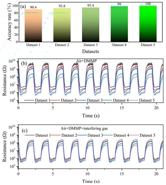 (a) The PSO-BPNN identification accuracy for DMMP in different test sets; Resistance response curves of the sensor for (b) category 2 and (c) category 4 in the 5 datasets.