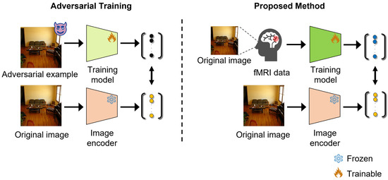 Difference between general adversarial training and the proposed method. Although adversarial training generally uses adversarial examples and original images, the proposed method replaces adversarial examples with brain activity and uses brain activity and original images. The different colors of the training model indicate that the models have the same architecture but different input dimensions.