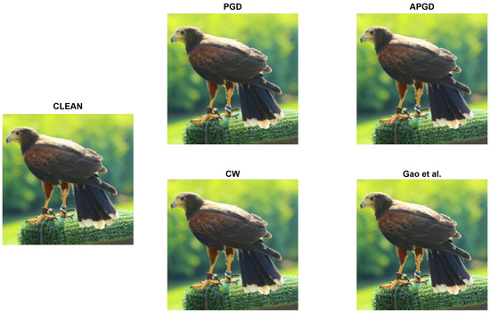 In this experiment, we used the dataset [36], which contains only brain activity data in response to nonattacked images. This is based on the hypothesis that the changes in brain activity caused by adversarial perturbations are minimal, meaning that brain activity would be indistinguishable from that induced by nonattacked images. Figure 4 shows a clean image selected from the test dataset used in this experiment, along with various adversarial examples. All images appear identical; thus, they are confirmed to be indistinguishable. In addition, to support this finding, Table 1 shows the average peak signal-to-noise ratio (PSNR) and structural similarity index measure (SSIM), which are indices for evaluating the image quality of two images, calculated from the original images for the adversarial examples () generated by each attack in this experiment. The smaller the difference between two images, the closer the PSNR to infinity and the SSIM to one. According to a previous study [46], the PSNR and SSIM at which humans are unable to perceive changes in the image are greater than 40 dB and 0.985, respectively. Table 1 shows that all attacks satisfy the condition of being “imperceptible to the human eye’’. As decreases, the changes in the image reduces, and the PSNR and SSIM increase further. This finding supports the validity of our hypothesis and experimental setup.