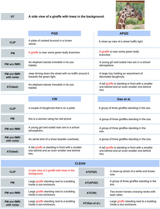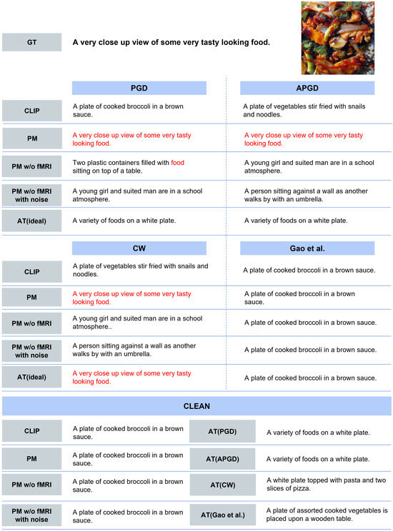 - Quantitative Evaluation. Table 2 presents the image similarity results. PM approaches the upper limit compared with each method. PM reaches approximately 90% of the upper limit for each attack. In addition, when clean images are input, the cosine similarity of each AT is approximately 0.7 at most, whereas PM achieves a very high value of 0.973. Table 3 presents the text similarity results. Although the improvement is smaller than that of the image similarity, it reaches approximately 80% of the upper limit for each attack. In particular, for PGD and APGD with a perturbation of , the text similarity is close to the upper limit. When clean images are input, the cosine similarity of each AT is 0.099–0.238, and PM exhibits higher values than CLIP. In terms of both evaluation metrics, a comparison of PM and PM w/o fMRI demonstrates that introducing brain activity in PM is effective.