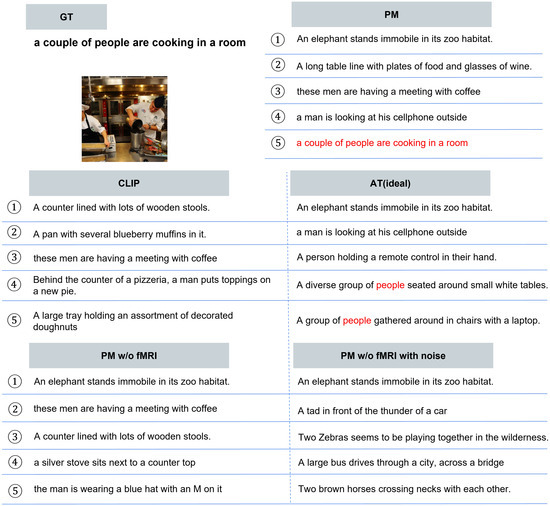 Table 6. Quantitative results of image-to-text retrieval. AT (ideal) is the method of adversarial training using each attack used in the evaluation, and the results shown in the gray background represent the upper limits. - Qualitative Evaluation. As shown in Figure 5, for the three types of attacks, PM succeeded in retrieving the correct caption for images for which the other comparison methods retrieved completely different results. In addition, PM exhibits successful retrieval in various scenes, not only in specific scenes. In some cases, as shown in Figure 6, PM retrieved captions that were semantically close, although it was not completely successful. Figure 7 presents the top-5 image-to-text retrieval results for PGD. In this figure, PM outputs the correct caption within the top-5 results. This indicates that the PM is able to adequately retain and extract the original semantic features from the brain activity data despite the image being perturbed by the adversarial attack. These results demonstrate that brain activity retains correct caption information and enables caption retrieval at a higher rank.