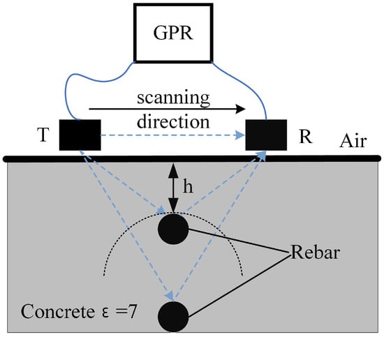 27]. As an efficient non-destructive testing (NDT) tool, GPR operates by emitting electromagnetic waves and capturing their reflected signals. The antenna sensors serve as the core components of GPR, responsible for both transmission and reception. The transmitting antenna converts electrical signals into electromagnetic waves, directing them into the subsurface, while the receiving antenna detects the reflected signals from underground structures. The core components of ground-penetrating radar (GPR) are the transmitting (T) and receiving (R) antenna sensors, as illustrated in