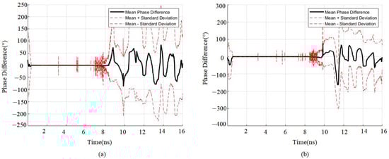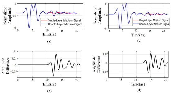 The normalized amplitude difference ranges between 0.5 and −0.5, and in certain cases, the two-way travel time exceeds 0.05. This indicates that during the 10–16 ns time window, the signal amplitude difference between single-layer and double-layer media is particularly pronounced. Notably, when encountering medium transitions, the fluctuations in signal intensity increase significantly. This phenomenon can be attributed to multiple reflections, refractions, and attenuation occurring as electromagnetic waves propagate through medium boundaries. These interactions lead to temporal signal dispersion and waveform distortion, especially in regions where the medium transitions are more complex. In such areas, the amplitude and waveform variations are more prominent, highlighting the influence of the medium on signal behavior.