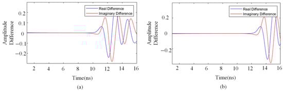 Figure 8a,b, the real parts of single-layer and double-layer signals exhibit significant differences within the 10–16 ns range. This suggests variations in signal propagation characteristics over time, which may be associated with differences in structure or medium propagation properties.