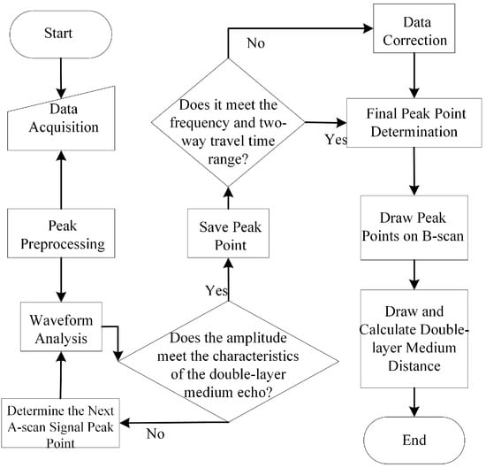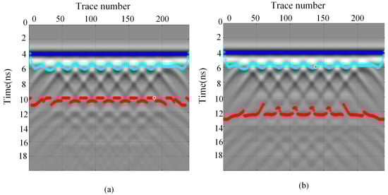 Figure 14. When analyzing A-scan data, the reflection points of double-layer rebar are first compared. Subsequently, in the B-scan image, the apex points of the hyperbolas corresponding to the first and second layers of rebar are identified and marked. By comparing the positions and shapes of different reflection points, the two layers of rebar can be effectively distinguished.
