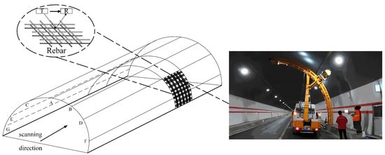 Figure 15, a ground-penetrating radar (GPR) system is mounted on the tunnel scanning vehicle to conduct tunnel inspections. The transmitter (T) emits electromagnetic waves, while the receiver (R) captures the reflected signals. During construction, the double-layer rebar spacing within the reinforcement mesh of the tunnel lining ranges approximately between 25 cm and 30 cm. The tunnel lining inspection is carried out using a GSSI SIR-3000 (GSSI, Nashua, NH, USA) system equipped with a GSSI shielded 400 MHz antenna.