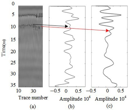Figure 16, the echo from the second-layer rebar exhibits similar phase and amplitude variations to the first-layer rebar. The presence of rebar is characterized by an amplitude lower than the adjacent in-phase negative peak, while horizontal signal aliasing leads to signal intersections around 10 ns, as indicated by the black line in