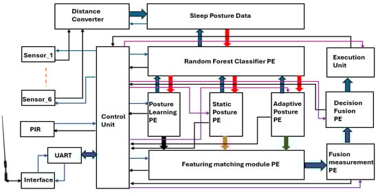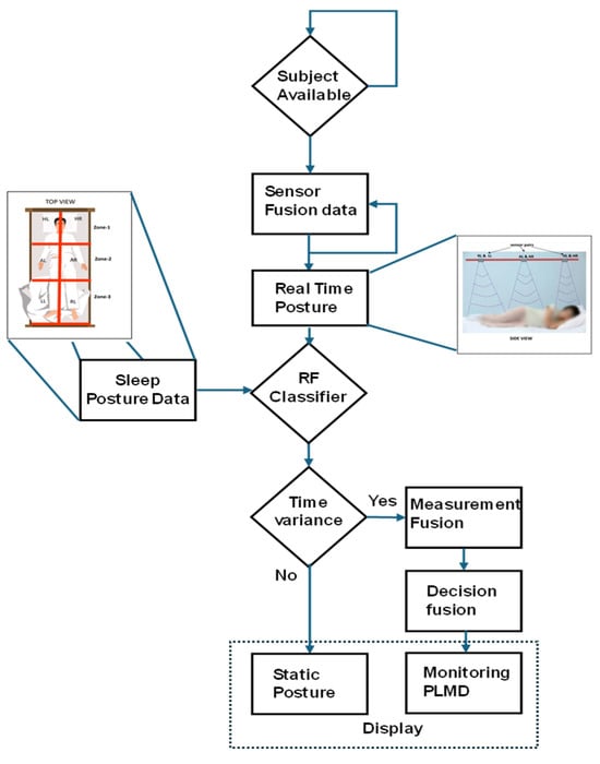 This module aims to define the subject positioned in a static or adaptive posture and detect PLMD using the feature-matching PE, the decision fusion PE, and the fusion measurement PE. As shown in Figure 4, in the RF classifier, a static posture is considered a time-invariant posture as per standard [], and subject movement from point to point within the sleeping area represents an adaptive posture, as defined in []. The feature-matching module PE was constructed using a binary search tree [], which plays a vital role in fusion measurement and decision fusion PEs. The core of the PLMD analysis involves hardware schemes, as shown in Figure 8.