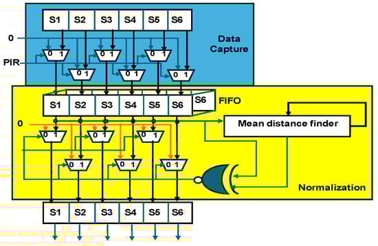 Figure 3 shows the hardware scheme for data capture and normalization. In this study, data were collected using six pairs of ultrasonic sensors, with the readings stored in arrays S1–S6. Data collection was enabled using a PIR sensor, which triggered the recording process, and all the external interfaces with the control unit are represented by blue lines. The FIFO buffer is defined with dimensions L × W × H, where L (length) = 20 bits, W (width) = 6 arrays, and H (height) = 40. The height value corresponds to the data stored at four iterations per second for 10 min (4 iterations × 10 min = 40 data blocks).