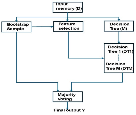 In Line 1, we start with the input dataset D, which consists of multiple data points represented as pairs, (X1, y1), (X2, y2), …, (Xn, yn), where each Xi denotes the input features, and yi is the corresponding target value. Line 2 initializes an empty list called forest (F), which will eventually store the collection of decision trees. In Line 3, a loop is initiated to run M times, with each iteration dedicated to training one decision tree. In Line 4, a bootstrap sample D_t is created by randomly sampling data points from D with replacement, introducing variability and promoting model robustness. Line 5 explains the random selection of a subset of m features from the total set of M features, which are used for splitting nodes in the tree, ensuring diversity among the trees in the forest. In Line 6, a decision tree is trained using the bootstrap sample D_t and the selected subset of features. Line 7 ensures that the tree is grown fully without any pruning, allowing it to learn detailed patterns from the training data. In Line 8, this fully grown decision tree is appended to forest F, progressively building the ensemble. Finally, in Line 9, after all M trees have been trained and added to the forest, the complete set {T1, T2, …, TM} is returned as the final output, i.e., the fully trained random forest model.