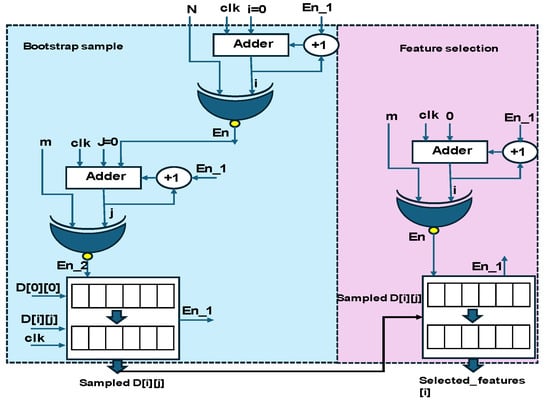 The bootstrap sample and feature selection hardware schemes are shown in Figure 5. They were processed based on two iterations and resulted in the sampled data D[i][j]. The resulting data were fetched into the feature selection module. The features of the pose were considered from the standard posture methods []. In digital models, the binary array patterns derived from data capture and normalization were used as references. The selected features [i] were fed to the RF decision tree.