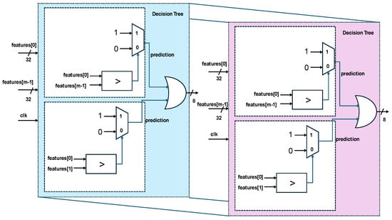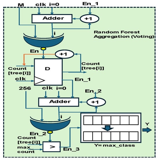 The final stage of the RF modules is voting, as shown in Figure 7. This is initiated by storing the count values, which are compared with the maximum value; the Y output is retained as the max class.