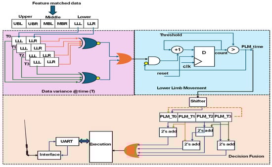 The feature-matching processing element (PE) provided posture confirmation, which served as input to the fusion measurement PE. The integrated data variance over time, in both static posture and lower limb movement, was used to evaluate PLM (periodic limb movement) duration. Data variance was captured at four iterations per second and stored over T1 to T3 time intervals. The lower limb—left (LLL) and lower limb—right (LLR) readings were compared each second to detect variations. When limb movement was detected, a duration counting module was activated, with thresholds set based on the subject’s PLMD stage. The duration values were stored in a FIFO buffer in the decision fusion block using a circular shifter mechanism. By comparing adjacent time windows, the system identified the duration of limb movement and inferred the subject’s PLMD stage. Before clinical diagnosis, the execution module shares this information with either a doctor or the subject’s caregiver, enabling a better understanding of PLMD.