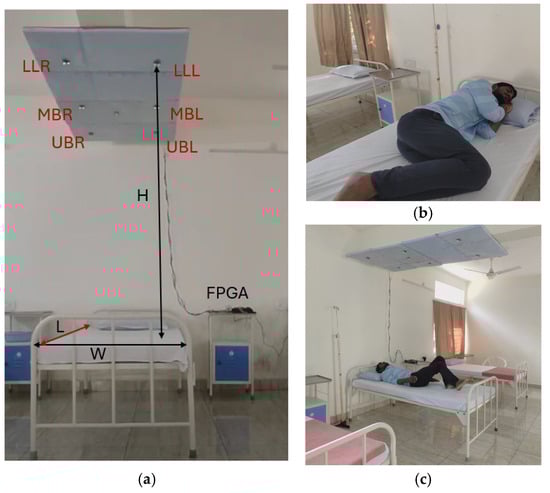 Figure 9a represents the environmental setup for the experiment. The distance between the sensor array and the bed was recorded as the height (H), the distance between the front and end of the bed was recorded as the length (L), and the width (W) was recorded as the difference between the left and right edges of the bed. Sensor arrays were positioned at the upper side (UBR, UBL), middle (MBR, MBL), and lower side (LLL, LLR). The distance was captured every 0.25 s from all sensors concurrently and processed using the hardware schemes. Machine learning was performed using the sensor’s distance and the time variance between distances for PLMD detection.