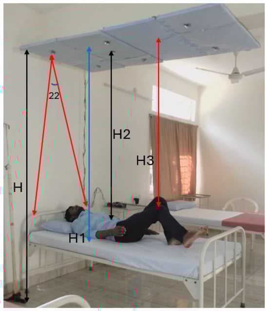 In this study, the difference between the ceiling and floor (H) was 2.8 m, and the distance between the sensor array and the bed (H1) was 2.2 m. The ultrasonic sensor operated with a coverage of 22°; the area covered on the bed with an H1 distance was around 80 cm. H2 was 2.1 m, and H3 was 1.9 m.