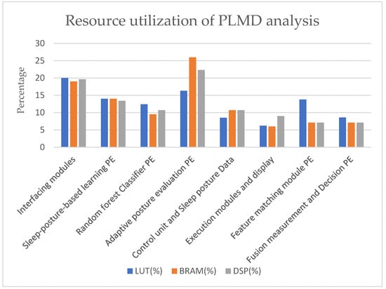 The overall resource consumption was as follows: 59% of LUT, 60% of BRAM (2.94 Mb), and 51% of DSP slices. The resource utilization of each module is presented in Figure 11. The x-axis represents the computational modules, and the y-axis shows the percentage of resource utilization. The interfacing modules consumed 20% of the LUT, 19% of the BRAM, and 20% of the DSP slices of overall device utilization, indicating more LUT consumption in these modules. The adaptive posture PE consumed the most BRAM and DSP slices, around 26% and 22%, respectively. It also involved more traversing steps and data storage. It is a key player in PLMD feature measurement.
