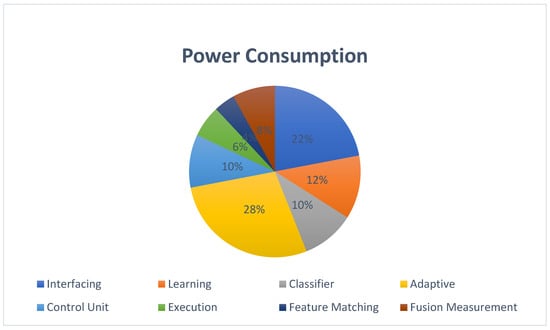 The power consumption of the device when operating a reconfigurable device (FPGA) is shown in Figure 12. According to the Xilinx power estimator (XPE), the static device power consumption was 1.4 W. In the overall power distribution, the power consumption of the adaptive posture PE accounted for 28%. XPE analysis also provided power consumption data for the other components. The second-highest power demand was attributed to interfacing with the external modules.