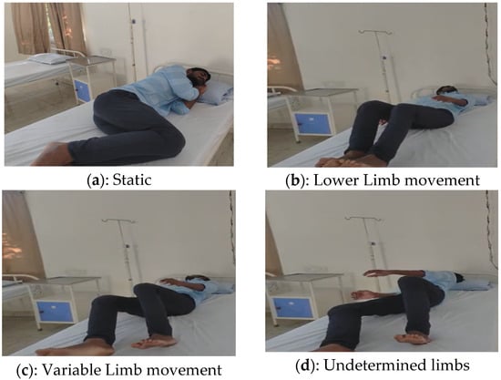 The periodic and aperiodic movements of the lower limb in sleep conditions have been estimated using different approaches, such as bed-based monitoring []. Bed-based sensor fusion for position changes was evaluated by Maggi and Sauter []. Actigraphy systems are preferred for PLMD analyses []. The RFID-based non-invasive method with a CNN algorithm was used to estimate sleep postures and movements []. Probabilistic data-driven approaches are preferred for analyzing PLMD data []. In [], a trained specialist manually evaluated the Emfit (electromechanical film) sensor readings to diagnose PLMD. Although no assessment of individual events was conducted, the average number of limb movements recorded by EMG (electromyography) and Emfit demonstrated a strong correlation, with a Spearman’s coefficient of 0.87.