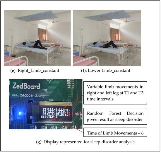 The experimental validations are represented in Figure 13a–g. The PLMD experimental results are shown in Figure 13a–f. The findings indicate that the proposed hardware schemes are versatile for the detection of PLMD. In Figure 13a, the subject is positioned in a static posture facing toward the right in the fetal pose. After some time in the supine position, lower limb movements were observed (Figure 13b,c). Figure 13d shows the undetermined states of the limbs due to continuous variable limb movements. PLMD versatility was observed with constant right limb movements, as shown in Figure 13e. Figure 13f represents constant movements in the right and left limbs. All the sleep postures were analyzed continuously using the FPGA accelerator. The determined sleep disorder is shown in Figure 13g for the postures shown in Figure 13c–d. Posture versus limb movements with respect to the period were classified as both-limb and one-limb movements, and both were included in the analysis. The PLMD analysis, displayed on the LCD of the Zed board FPGA, is illustrated in Figure 13g, presenting an alternative approach to limb movement analysis. In this experiment, T1 marks the initial event where the lower limb—left (LLL) is in motion, represented as logic ‘1’, while the lower limb—right (LLR) remains static, denoted as logic ‘0’. At event T3, the LLL becomes static (logic ‘0’), and the LLR is in motion (logic ‘1’). The time of limb movement (TLM), representing the duration of limb activity, was measured as six units. Each unit duration may vary depending on the individual’s condition or PLMD stage.