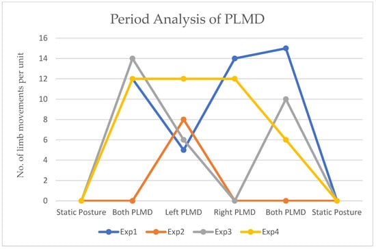 PLMD was detected with four different lower limb movements: In Exp1, both left and right limbs moved. In Exp2, the right limb remained constant, whereas the left limb moved. In Exp3, only the right lower limb moved. In Exp4, limb movement was constant across various durations; thus, it was classified as a non-PLMD status. When both limbs changed position for only one instant and then maintained a static position, it was considered a pose change and therefore not PLMD. The x-axis represents lower limb movement events, including static, as well as PLMD in the left, right, and both limbs, while the y-axis shows the number of limb movements per unit time.