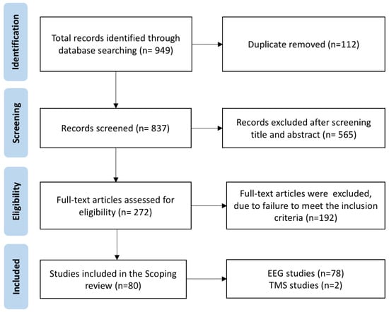 A total of 949 studies were obtained through various databases. Among these, 112 articles were singled out, following the exclusion of duplicates based on the screening of titles and abstracts (Figure 1). A total of 565 articles were excluded after the screening, and 192 papers were excluded in the next step, based on eligibility criteria, resulting in 80 articles that were incorporated into this review. Among these, seventy-eight papers pertained to EEG studies, while two papers focused on TMS studies. The initial search strategy that will be used when searching the MEDLINE or (PubMed) database is presented in Figure 1.