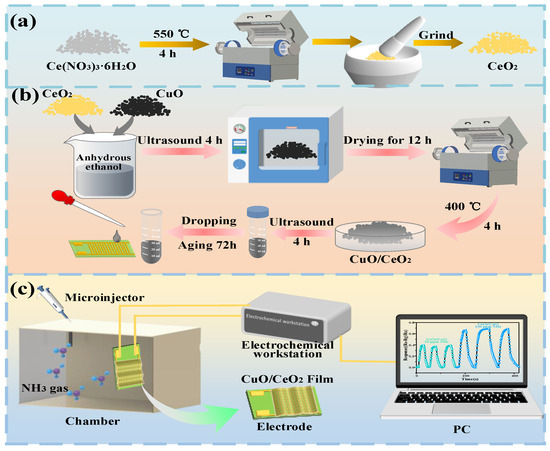 The prepared CuO/CeO2 composite was added at 10 mg to an appropriate amount of anhydrous ethanol and magnetically stirred for 5 h to obtain a well-mixed solution. Then, the mixed solution was added dropwise onto the fork finger electrode. Finally, the gas-sensitive materials were dried at 60 °C for 24 h to obtain a CuO/CeO2 composite-based gas sensor. The preparation process is shown in Figure 1b.