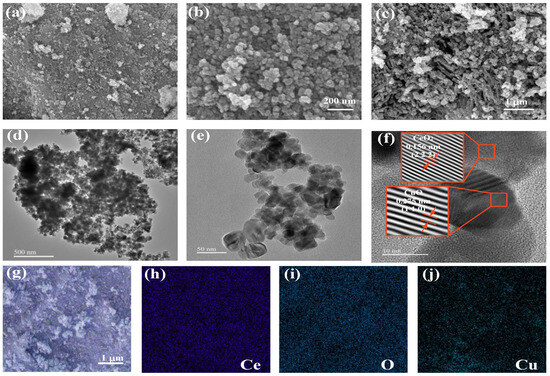 Characterization of the materials. (a,b) SEM characterization of CeO2 at different scales, (c) SEM characterization of CuO, (d–f) TEM images at different scales, (d) 500 nm, (e) 50 nm, (f) 10 nm. (g) Three-element composite images of the composite Ce, O, and Cu, and (h–j) elemental characterization images of Ce, O, and Cu, respectively.