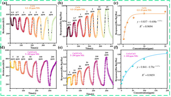 Gas-sensitive properties of the materials. (a) Resistive response of CeO2 to different concentrations of ammonia, (b) response values of CeO2 to different concentrations of ammonia, (c) fitted curves of response values of CeO2 to different concentrations of ammonia, (d) resistive response of CuO/CeO2 to different concentrations of ammonia, (e) response values of CuO/CeO2 to different concentrations of ammonia, and (f) fitted curves of response values of CuO/CeO2 to different concentrations of ammonia.