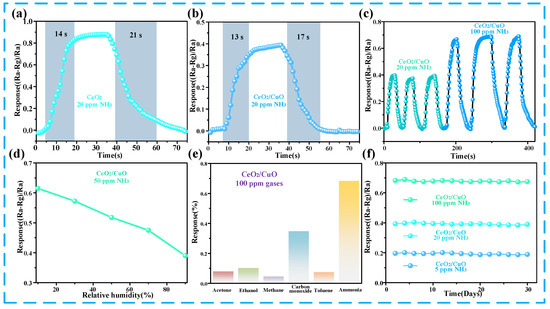 Different parameters of the prepared sensors were measured in order to verify that the prepared sensors have excellent performance. Firstly, the response/recovery time of the CeO2 sensor and CuO/CeO2 sensor were tested in an ammonia atmosphere at 20 ppm, as shown in Figure 4a,b. Also, CeO2 and CuO/CeO2 sensors have a fast response/recovery time for ammonia, and the response/recovery time of the CuO/CeO2 sensor is 13 s/17 s at 20 ppm, which is lower than that of CeO2 sensor. Figure 4c represents the cyclability of the prepared CuO/CeO2 sensors, which showed good cyclability at 20 ppm and 100 ppm ammonia concentrations, and their response remained essentially unchanged at the same concentration. In Figure 4d, the response of the CuO/CeO2 sensor to 50 ppm ammonia gas at 20–90% humidity was tested. The response value of the sensor displays a downward trend with an increasing humidity, because H2O molecules also interact the active sites on the surface of the CuO/CeO2 composites under high-humidity conditions, resulting in less ammonia adsorption and a low gas-sensing response value. The selectivity of the sensor is shown in Figure 4e. Here, the cross interferences of five common interfering gases (acetone, ethanol, methane, carbon monoxide toluene) were detected. The CuO/CeO2 sensor has the largest response to ammonia, which indicates that the CuO/CeO2 sensor has excellent selectivity to ammonia. Finally, the extended-term stability is also a crucial indicator to determine whether the sensor can be used for a long time or not. Figure 4f tested the response of the composite sensor under different ammonia concentrations for 30 days, and the response of the sensor remained stable, which proved that the outstanding combination with CuO/CeO2 and NH3 molecules.