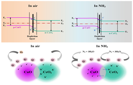 The ammonia gas-sensing mechanism of the CuO/CeO2 sensor is schematically presented in Figure 5. The gas-sensing response of the sensor depends on the active sites offered by the CuO/CeO2 heterojunction nanomorphology on one hand and is determined by the resistance modulation ability on the other hand. In air, the energy bands at the interface bend due to the different work functions when p-type CuO is in contact with n-type CeO2 and eventually reach the same Fermi energy level. Simultaneously, the electrons will shift from the conduction band of CeO2 to form p-n junctions at the CuO/CeO2 heterojunction interface [43]. When the sensor is exposed to air at room temperature, oxygen molecules (O2) interact with the surface of the gas-sensitive materials. These adsorbed O2 molecules can capture free electrons from CuO/CeO2 to form oxygen ions (O2−) through the following reaction, as shown in Equations (2) and (3) [44]. This process leads to a more pronounced immobilization of electrons within the conduction band. As a consequence, the width of the electron-depletion layer expands further, causing an elevation in resistance. On the contrary, when the sensor is exposed to an ammonia gas, NH3 molecules will interact with the active sites of the sensitive materials. Then, the adsorbed NH3 molecules react with the pre-adsorbed O2− as shown in Equations (4) and (5) [45].