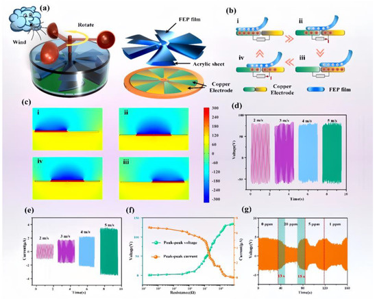 (a) Structural diagram of the prepared rotary TENG and schematic diagrams of its rotor and stator, (b) the working principle of the TENG, (c) finite element simulation analysis of the TENG, (d) the open-circuit voltage and (e) the short-circuit current of the TENG at different wind speeds, (f) the impedance matching curve of the TENG at a wind speed of 5 m/s, and (g) the voltage variation curve of the TENG-powered NH3 sensor in response to changes in the NH3 concentration.