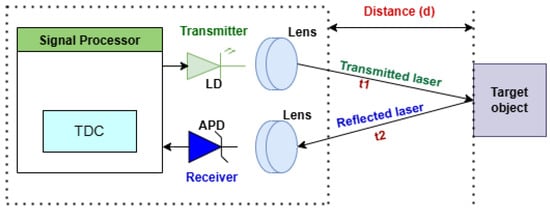 LiDAR devices use laser light to determine distances and create detailed 3D maps of their surroundings [24,25,26]. A LiDAR sensor, which determines the precise distance from a target object by emitting a laser, includes a laser diode (LD), an avalanche photodiode (APD), a time-to-digital converter (TDC), and signal processing modules, as depicted in Figure 1. Therefore, these are the primary components of a LiDAR system, which are required for data capture, processing, and interpretation to measure distances and detect objects: