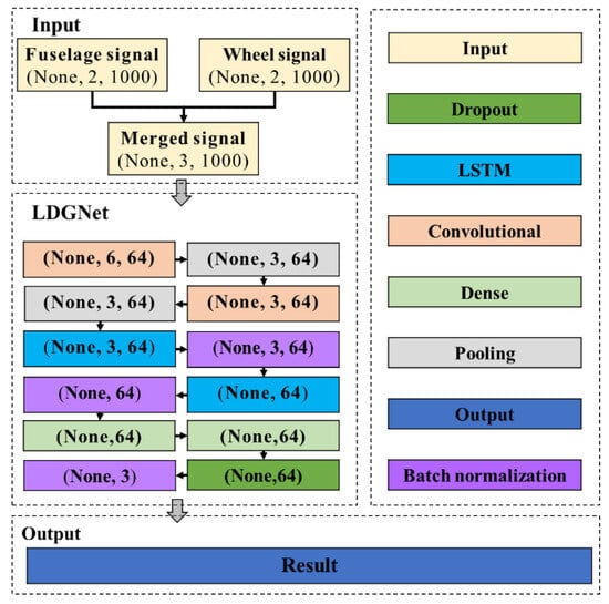 The structure of the designed LDGNet is shown in Figure 3. The sensor-acquired fuselage and wheel signal are merged as a 3 × 1000 matrix including time, fuselage and wheel signal when the wheel is in contact with ground during the aircraft landing phase. Firstly, the merged signal is imported to convolutional layers and pooling layers for feature extraction on spatial sequences. Features of the merged signal are extracted by two convolutional layers, each followed by a pooling layer that retains key features while reducing spatial dimensions through down-sampling, thereby decreasing computational complexity, controlling overfitting, and enhancing translation invariance. Secondly, the processed data matrix is imported to LSTM layers and batch normalization layers for feature extraction in time series, and is merged as 1D data for importing to dense layer. Softmax is applied in a dense layer for converting the original output of the network into a probability distribution, where each output value represents the predicted probability of the corresponding class, enabling the model to give a confidence level for each possible diagnosis. Dropout layer is designed to reduce the dependence on a specific combination of neurons, thereby effectively alleviating the overfitting problem, via randomly discarding a certain proportion of neuronal connections during the training process. The batch normalization layer is designed to effectively normalize the activation values into a fixed interval by calculating the mean and standard deviation on each small batch of data and making corresponding bias adjustments and scaling of the data. Compared with CNN and LSTM, the proposed LDGNet combines the advantages of CNN and LSTM, and the features of sensor-collected data in both spatial and time sequences are extracted to improve the performance of health monitoring.