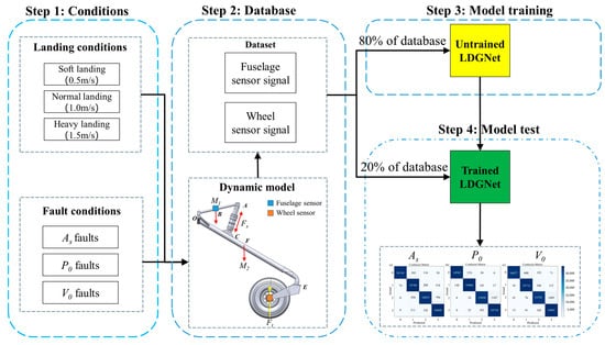 In this paper, a deep learning method LDGNet is proposed with the sensor network suggested in Section 2.1. A dynamic model of nose landing gear is developed for dynamic responses for the general aviation aircraft considered in this paper. Accuracy of the developed model is analyzed via comparing the simulation results with data from practical flights. Three common faults in shock-absorbing systems are considered in this paper, including damping orifice area (AS) faults, initial gas pressure (P0) faults and initial gas volume (V0) faults, and three typical landing conditions are considered, including soft, normal and heavy landing. For developing the training database, virtual sensors are mounted on the fuselage and wheel of landing gear model to acquire simulated dynamic signals under all considered conditions. The proposed LDGNet is trained by 80% of the database, and the performance of the LDGNet is tested by the remaining 20% of the database.