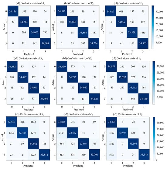 Confusion matrix of LDGNet under the landing speed of 0.5 m/s (a1–c1), 1.0 m/s (a2–c2) and 1.5 m/s (a3–c3).